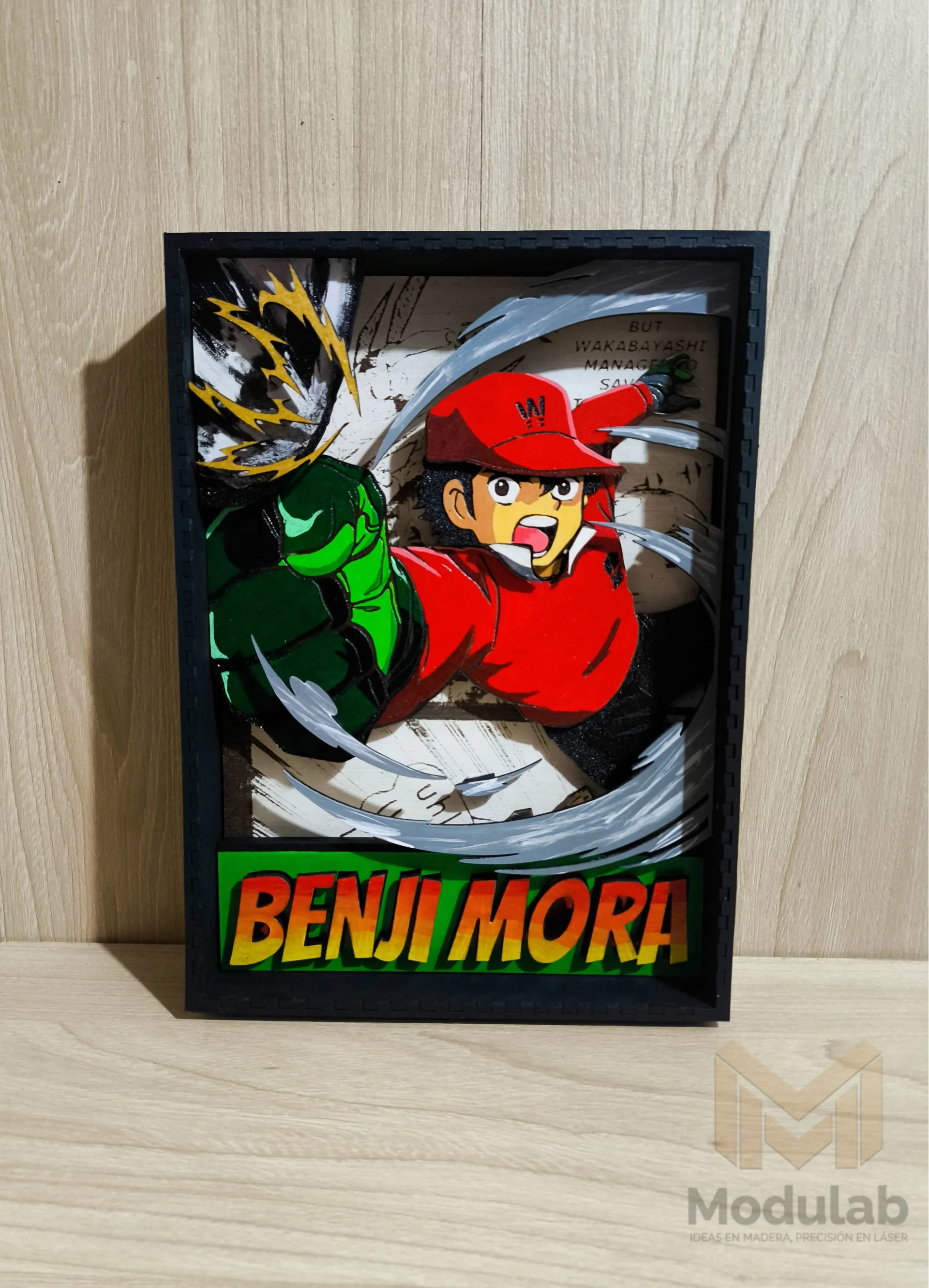 Cuadro decorativo a capas de 18 × 26 cm, elaborado en MDF mediante corte láser y pintado a mano. Presenta la figura de Benji Price, personaje de Supercampeones. Incluye acabado en barniz, que realza los colores y brinda mayor durabilidad a la pieza. Ideal para decoración o colección.