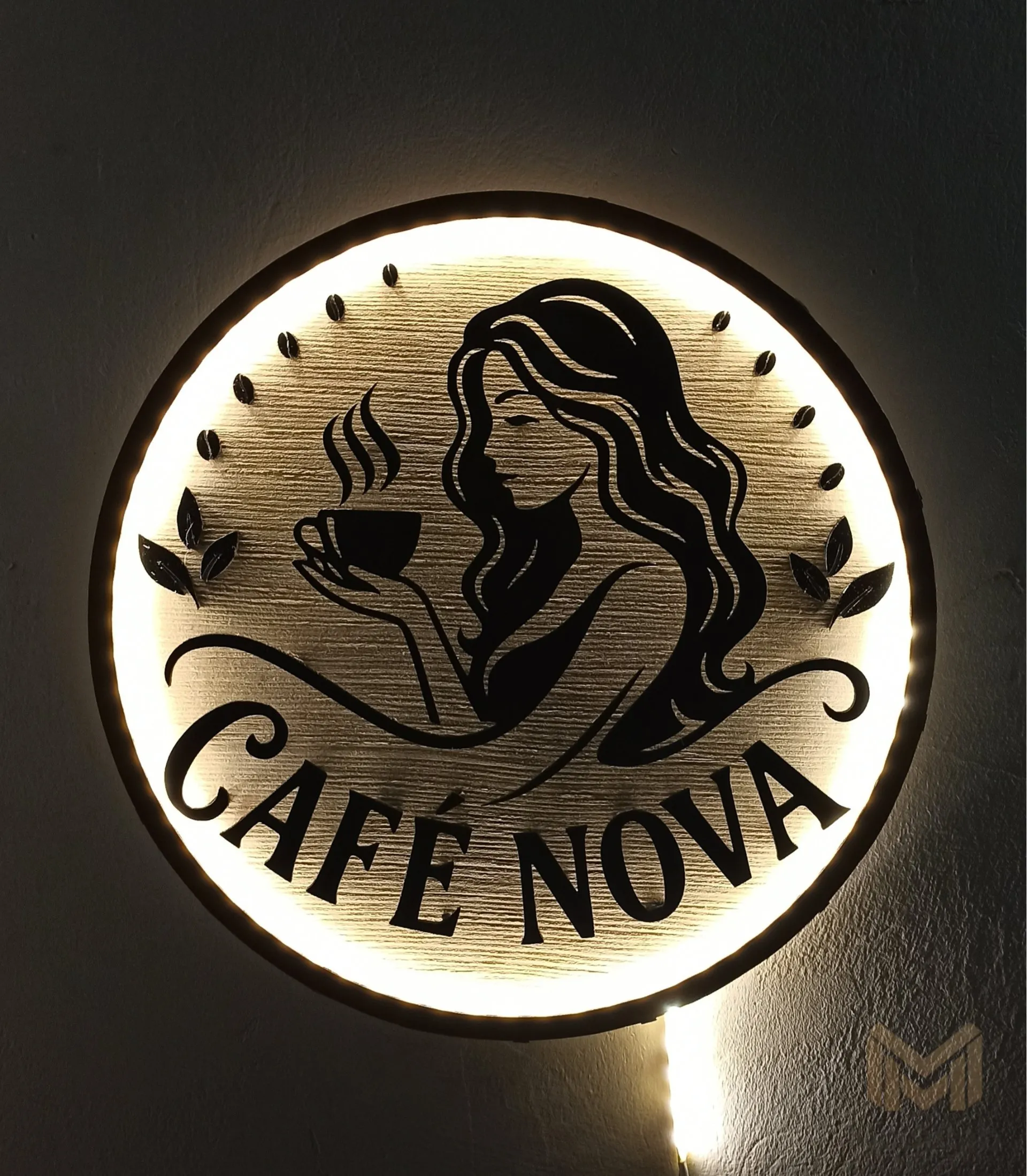 Letrero circular de 40 cm de diámetro, ideal para resaltar la identidad de tu negocio. Elaborado en MDF con acabado tipo roble claro, que aporta una apariencia cálida y natural. Los detalles en acrílico negro crean un contraste elegante, acompañado de iluminación LED que realza cada elemento del diseño. Cuenta con un logo único y completamente personalizado. Perfecto para dar un toque distintivo, moderno y acogedor a tu espacio comercial.